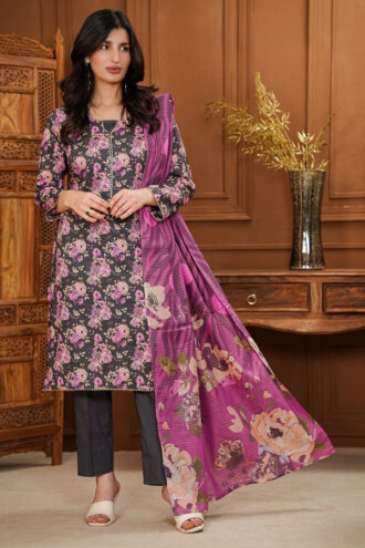 Refresh your wardrobe with the timeless charm of Nikhar by Meerab. This elegant 3-piece unstitched suit.